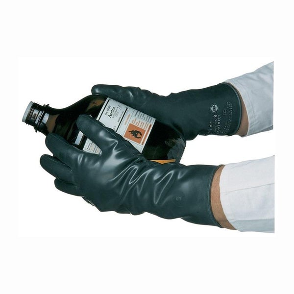 mit Rollrand hochflexibler, extrem schützender Chemikalienhandschuh aus Butylkautschuk geeignet für die extremen Belastungen bei Arbeiten mit Ester und Ketonen gasundurchlässig erlaubt den Einsatz auch unter widrigen klimatischen Bedingungen kurzfristige Temperaturbeständigkeit zwischen ca. -40 °C und ca. 130 °C kombinierbar mit Chemikalienschutzanzügen Anwendung: Chemische Industrie, Farb-, Lack-, Kunststoff- und Klebstoffverarbeitung, Entsorgung von Abfällen, Sanierung von Deponien, Herstellung und Anwendung von Pflanzenschutzmitteln geeignet für: Säuren und Laugen Glykole und Glycerin kurzkettige Ester kurzkettige Ketone und Aldehyde Nitrile Weichmacher (DMP, DOP, ...) nicht geeignet für: aliphatische Kohlenwasserstoffe aromatische Kohlenwasserstoffe und Chlorkohlenwasserstoffe Merkmale EN-ISO-Schnittfestigkeit (Newton): X EN 374-1 Type: A