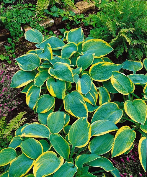 Hosta sieboldiana ‘Samurai’, die eindrucksvolle Blaublatt-Funkie bzw. Herzblattlilie, ist eine langlebige Blattschmuckstaude, die mit majestätischen, stark gewellten und dickfleischigen Blättern begeistert. Das Laub zeigt ein edles Blaugrün mit dezent gelblicher Randzeichnung, im Jahreslauf elegant nachdunkelnd und mit markanter Aderung, wodurch ein hochwertiger, strukturbildender Effekt im Schattenbeet entsteht. Im Frühsommer erheben sich über dem breiten, horstigen Wuchs schlanke Blütenstände mit zarten, hell lavendelfarbenen bis fast weißen Glockenblüten, die den ruhigen Laubcharakter perfekt ergänzen, ohne aufdringlich zu wirken. Als Gartenstaude eignet sich ‘Samurai’ ideal für halbschattige bis schattige Bereiche, vom klassischen Staudenbeet über den Vorgarten bis zur Unterpflanzung von Gehölzen; als Solitär setzt sie wirkungsvolle Akzente, in Gruppenpflanzung formt sie dichte, repräsentative Teppiche. Auch als Kübelpflanze auf der schattigen Terrasse oder am Teichrand kommt ihr edler Habitus hervorragend zur Geltung. Bevorzugt wird ein humoser, lockerer, gleichmäßig frischer bis feuchter Boden mit guter Nährstoffversorgung; eine schattige Lage ohne heiße Mittagssonne erhält die satte Blattfarbe. Mulch und regelmäßige, maßvolle Wassergaben fördern einen kräftigen, breitbuschigen Aufbau, eine Düngung im Frühjahr unterstützt das vitale Wachstum. In Kombination mit Farnen, Astilben oder Heuchera entstehen harmonische, langlebige Schattenkompositionen. ‘Samurai’ ist winterhart, treibt im Frühjahr zuverlässig wieder aus und überzeugt über viele Jahre als edler Zierstrauch-Partner im Staudenbeet und als pflegeleichter Gartenstrauch-Ersatz für wirkungsvolle, ruhige Gartenbilder.