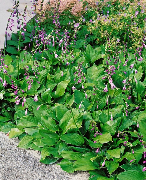 Hosta ventricosa, die elegante Funkie bzw. Herzblatt-Lilie, ist eine charakterstarke Blattschmuckstaude für schattige bis halbschattige Bereiche im Garten. Ihre breit herzförmigen, glänzend dunkelgrünen Blätter mit markanter Aderung bilden dichte, horstige Büsche und setzen vom Frühjahr bis zum Herbst ruhige, edle Strukturakzente. Im Sommer, meist von Juni bis August, erheben sich schlanke, stabile Blütenstiele über das Laub und tragen zahlreiche trichterförmige, violett bis purpurfarbene Glockenblüten, die der Staude zusätzliche Leichtigkeit verleihen. Der Wuchs ist kompakt bis ausladend, ideal für das Schattenbeet, den Gehölzrand und den Vorgarten, ebenso für die Rabatte als Blattschmuckpflanze oder als Solitär auf halbschattigen Flächen.