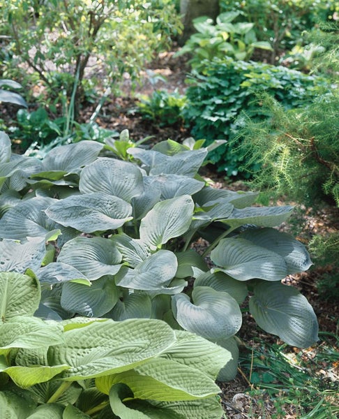Hosta x cultorum ‘Empress Wu’, auf Deutsch die Riesen-Funkie, ist eine außergewöhnlich großwüchsige Blattschmuckstaude, die im Schattengarten eindrucksvolle Akzente setzt. Ihr horstiger, aufrechter bis breitbuschiger Wuchs bildet imposante, herzförmige, leicht gewellte Blätter in tiefem Blaugrün bis Dunkelgrün, die mit ihrer kräftigen Textur und eleganten Nervatur jede Pflanzung strukturieren. Im Sommer erscheinen lange Blütenstände mit zahlreichen, zart lavendelfarbenen bis hellvioletten, glockenförmigen Blüten, die den dekorativen Blattschmuck dezent ergänzen, ohne seine Wirkung zu überstrahlen.
