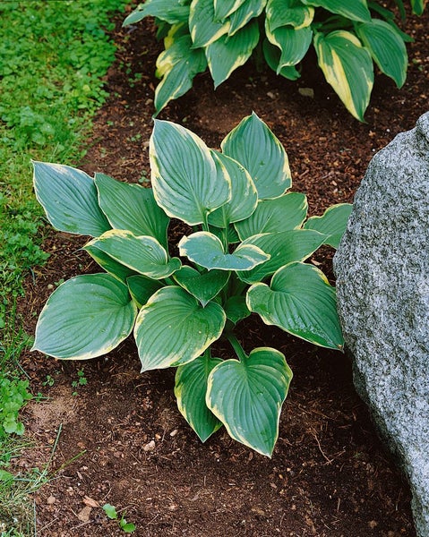 Hosta x cultorum ‘Fringe Benefit’, die elegante Funkie, ist eine charakterstarke Blattschmuckstaude für halbschattige bis schattige Gartenbereiche. Ihr horstiger, kompakter Wuchs bildet mit der Zeit dichte, breitbuschige Polster, die durch zweifarbige, herzförmige Blätter bestechen: ein satt grün bis blaugrün getöntes Zentrum wird von einer breiten, cremegelben bis vanillegelben Randzeichnung eingerahmt, sanft gewellt und mit schöner Blattstruktur. Im Sommer erscheinen auf schlanken Stielen zarte, hell lavendelfarbene bis weißliche Glockenblüten, die den eleganten Eindruck unterstreichen und die Staude zusätzlich aufwerten. Als robuste Schattenpflanze eignet sich diese Hosta ideal für Beete im Vorder- und Mittelgrund, für die Unterpflanzung von Gehölzrand und Zierbäumen sowie für naturnahe Rabatten, wo sie in Gruppenpflanzung Teppiche aus attraktivem Laub bildet. Ebenso überzeugt sie als Kübelpflanze auf der schattigen Terrasse oder im Innenhof und wirkt als Solitär im Schattenbeet besonders edel. Der optimale Standort ist windgeschützt, mit humosem, gleichmäßig frischem bis feuchtem, gut durchlässigem Boden; eine Mulchschicht hilft, die Feuchte zu halten, während Staunässe zu vermeiden ist. Ein lockerer, nährstoffreicher Gartenboden fördert sattes Blattwerk und eine harmonische Wuchsform. Im Frühjahr sorgt eine maßvolle Gabe organischer Dünger für vitalen Austrieb, verblühte Stiele können entfernt werden, das Laub zieht im Herbst ein. Hosta ‘Fringe Benefit’ ist eine langlebige, winterharte Staude, die Struktur, Farbe und Ruhe in schattige Gartenbereiche bringt und als Blattschmuckpflanze das ganze Gartenjahr über für gepflegte Wirkung sorgt.