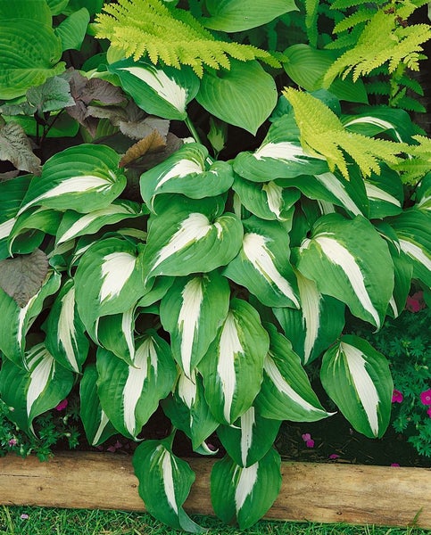 Hosta x cultorum ‘Night Before Christmas’, auf Deutsch als Funkie oder Herzblattlilie bekannt, ist eine edle Blattschmuckstaude, die mit markanten, kontrastreichen Blättern begeistert. Das Laub zeigt breite, dunkelgrüne Ränder und eine cremeweiße bis reinweiße Mitte, die im Jahresverlauf von zartem Hellgrün zu leuchtendem Weiß aufhellt. Die horstig wachsende Schattenstaude bildet dichte, breitbuschige Büsche mit eleganter Blattstruktur und erreicht mittlere Höhen, wodurch sie in jedem Ziergarten eine ruhige, hochwertige Präsenz entfaltet. Im Sommer erheben sich über dem Laub zarte, hellviolette bis lavendelfarbene Blüten an aufrechten Stielen, die die grafische Wirkung des Laubes wunderbar ergänzen.