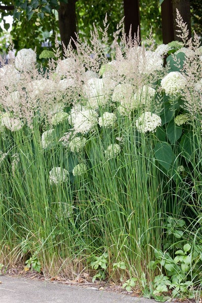 Hydrangea arborescens 'Grandiflora', die klassische Waldhortensie oder Baumhortensie, begeistert als eleganter Blütenstrauch mit üppigen, schneeballartigen Blütenständen. Von Juni bis in den September zeigt sie große, cremeweiße bis reinweiße Teller, die im Verlauf zart grünlich nachreifen und später einen dekorativen, hellbeigen Ton annehmen. Das mittelgrüne, eiförmige Laub bildet einen attraktiven Kontrast und unterstreicht die runde, buschige Wuchsform dieses pflegeleichten Gartenstrauchs, der ausgewachsen etwa 1 bis 1,5 Meter hoch und breit wird. Als Zierstrauch im Staudenbeet, im romantischen Bauerngarten, am halbschattigen Gehölzrand oder als Solitär im Vorgarten setzt die Sorte stilvolle Akzente; ebenso überzeugt sie in Gruppenpflanzungen und in lockeren, blühenden Hecken. Auf Terrasse und Balkon macht sie sich als Kübelpflanze hervorragend, sofern das Substrat gleichmäßig frisch bis feucht bleibt. Ein Standort in Halbschatten ist ideal, doch mit ausreichender Bodenfeuchte verträgt die Waldhortensie auch sonnigere Lagen. Der Boden sollte humos, gut durchlässig und schwach sauer bis neutral sein; eine Mulchschicht hilft, die Feuchtigkeit zu halten. Ein kräftiger Rückschnitt im zeitigen Frühjahr fördert standfeste Triebe und noch größere Blütenkugeln, während eine jährliche Gabe von Kompost die Blühfreude unterstützt. In Kombination mit Farnen, Funkien, Schattenstauden und feinen Ziergräsern entstehen harmonische, langlebige Pflanzbilder, die den ganzen Sommer über für eine helle, elegante Note im Garten sorgen.