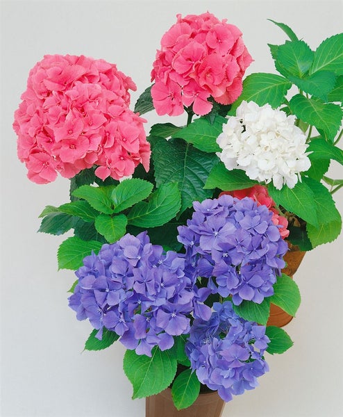 Hydrangea macrophylla 'Trio Mix', Hortensie, mehrfarbig, 50–60 cm