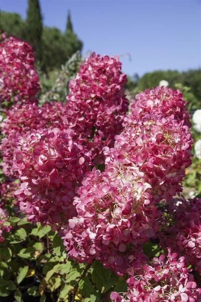 Hydrangea paniculata ‘Diamond Rouge’ – die Rispenhortensie, auch als Gartenhortensie bekannt, begeistert als eindrucksvoller Blütenstrauch mit außergewöhnlichem Farbspiel. Von Juli bis Oktober entfalten sich große, dicht besetzte Rispen, die zunächst reinweiß erscheinen, rasch in zartes Rosé übergehen und schließlich in ein intensives Rubinrot bis Purpurrot ausreifen. Das frischgrüne, sommergrüne Laub unterstreicht die Farbdynamik und kann im Herbst zusätzlich warme Töne annehmen. Der Wuchs ist aufrecht, buschig und gut verzweigt, mit kompakter, harmonischer Form, die sich ideal für moderne und klassische Gartengestaltungen eignet.