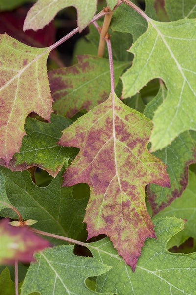 Hydrangea quercifolia ‘Ice Crystal’ –R–, die Eichenblättrige Hortensie, ist ein außergewöhnlicher Blütenstrauch mit unverkennbar tief gelapptem, eichenähnlichem Laub und eleganten, schneeweißen Rispenblüten. Die dicht gefüllten, zunächst cremeweißen bis reinweißen Blütenstände erscheinen ab Juni und halten bis in den Spätsommer, wobei sie oft sanft nach rosé überhauchen. Im Herbst entfaltet dieser Zierstrauch seine ganze Pracht: Das Laub leuchtet in intensiven Purpur? bis Bordeaux-Tönen, während die im Alter leicht abschilfernde, zimtbraune Rinde attraktive Winterakzente setzt. Der Wuchs ist kompakt, aufrecht und breitbuschig, ideal für kleinere Gärten und den stilvollen Vorgarten ebenso wie für das Staudenbeet, den Gehölzrand oder als strukturstarker Solitär. Auch als Gartenstrauch in Gruppenpflanzungen sowie als lockere, niedrige Heckenpflanze liefert die Sorte harmonische Bilder; im ausreichend großen Kübel verschönert sie Terrasse und geschützte Hoflagen.