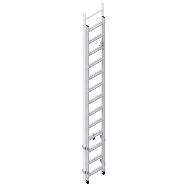 Leiterteil kann mit Hilfe eines Seilzugs von oben und unten ausgelöst werden Max. Durchgangshöhe 2.800 mm Für Steighöhen ab 4,80 m Bei der Ausführung mit Rückenschutzkorb ist der zugehörige Abschnitt des Rückenschutzkorbs (Höhe 1.730 mm) mit inbegriffen