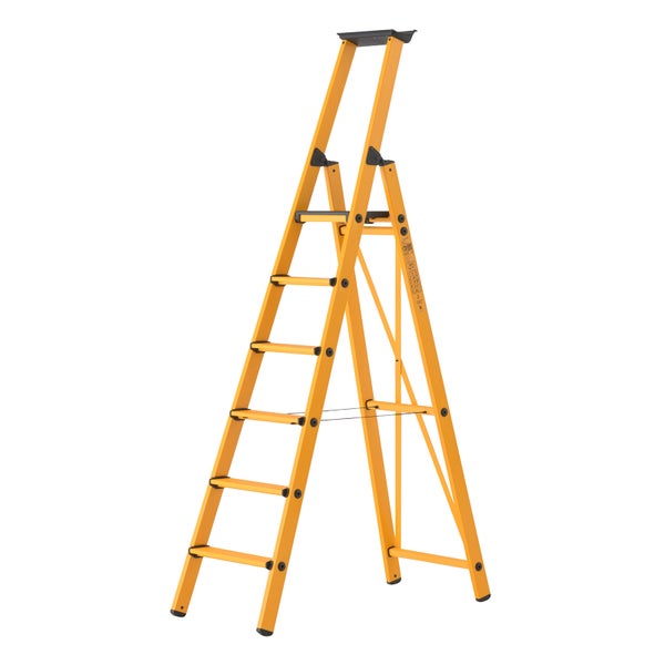 Bequemer und sicherer Stand bei längeren Arbeiten dank großflächiger Plattform Zuverlässige Spreizsicherung durch hochfeste Perlongurte Ergonomisches Arbeiten auf 88 mm Stufentiefe 100% ohne Metall. Alle Bauteile aus (Glasfaser-)Kunststoff Ideal geeignet für Chemie-, Elektro- und Lebensmittelindustrie Plattformabmessung 250 x 250 mm Gesetzliche Gewährleistung Zugelassen für 1.000 V