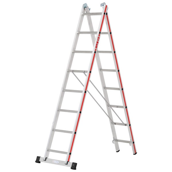 Multifunktionale Verwendung Rutschsichere, geriffelte Sprossen aus Walzprofil Zuverlässige Spreizsicherung durch hochfesten Perlongurt Leiterinnenbreite 300 mm (Oberteil) Massive Stahlbeschläge Verpresste Leiterfüße Nach EN 131 Hinweis Zur TRBS-konformen Verwendung als Arbeitsplatz ist bei Sprossenleitern entsprechendes Zubehör wie Einhängetritte (Universal-Keitertritt klappbar zu verwenden.)