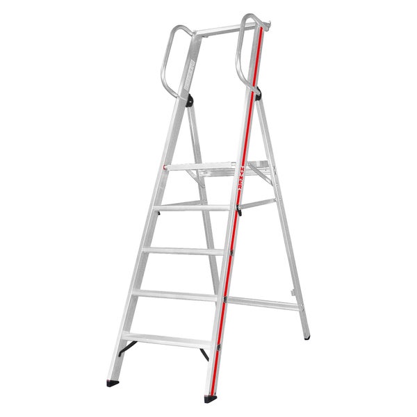 Bequemer und sicherer Stand bei längeren Arbeiten dank großflächiger Plattform Ergonomisches Arbeiten auf 80 mm Stufentiefe. Vorderkante mit Holm bündig Massive Ablageschale aus Aluminium mit Eimerhaken Aushängbare, starre Strebe verhindert unbeabsichtigtes Zusammenklappen Ergonomisch geformte, beidseitige Handläufe Stabiler Stand der Leiter durch konische Ausführung Plattformabmessung 440 x 400 mm Geländerhöhe (über Plattform) 800 mm Nach EN 131, TRBS-Konform