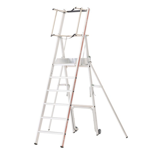 Bequemer und sicherer Stand bei längeren Arbeiten dank großflächiger Plattform Optimaler Transport mittels Kipprollen Sicherer Stand mittels transportoptimierter Klappausleger Freihändiges, sicheres Arbeiten dank umlaufender Absturzsicherung Komfortabler Aufstieg dank 80 mm Stufentiefe Strebenfreiheit am Stützteil für flexibleren Einsatz der Leiter Plattformabmessung 500 x 424 mm