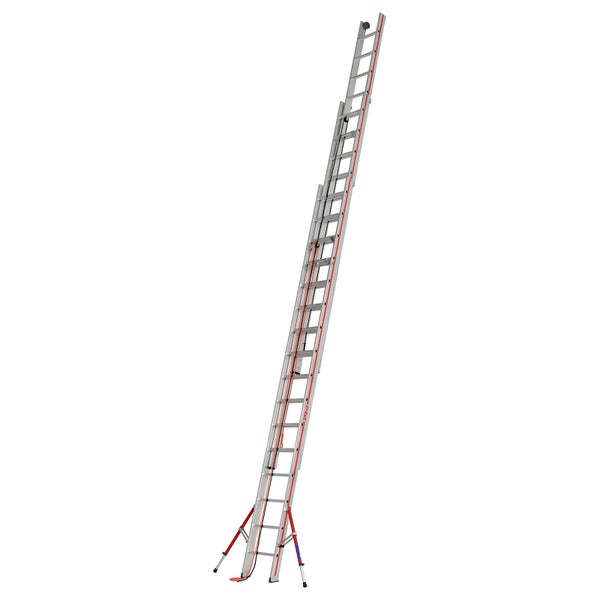 Erhöhte Rutschsicherheit der Sprossen dank stark profiliertem Strangpressprofil Vereinfachtes Ein- und Ausfahren der Leiter durch Führungsbeschläge aus Stahl mit Kunststoffgleitern Komfortables Ausfahren der Leiter mittels Wandlaufrollen Sicherer Stand mittels klappbarer, transportoptimierter Teleskopausleger Hohe Standfestigkeit dank Klappfüße mit großer Auflagefläche Langlebige, reißfeste Seile für eine sichere Höhenverstellung Leiterinnenbreite 300 mm (Oberteil) Hinweis Zur TRBS-konformen Verwendung als Arbeitsplatz ist bei Sprossenleitern entsprechendes Zubehör wie Einhängetritte (Universal-Leitertritt klappbar) zu verwenden. Vor dem kompletten Ausfahren der Leiter muss zunächst das Mittelteil um mindestens 2 Sprossen ausgefahren sein!