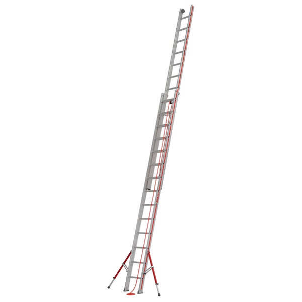Erhöhte Rutschsicherheit der Sprossen dank stark profiliertem Strangpressprofil Vereinfachtes Ein- und Ausfahren der Leiter durch Führungsbeschläge aus Stahl mit Kunststoffgleitern Komfortables Ausfahren der Leiter mittels Wandlaufrollen Langlebiges, reißfestes Seil für eine sichere Höhenverstellung Sicherer Stand mittels klappbarer, transportoptimierter Teleskopausleger Hohe Standfestigkeit dank Klappfüße mit großer Auflagefläche Leiterinnenbreite 300 mm (Oberteil) Hinweis Zur TRBS-konformen Verwendung als Arbeitsplatz ist bei Sprossenleitern entsprechendes Zubehör wie Einhängetritte (Universal-Keitertritt klappbar zu verwenden.)