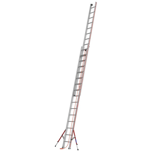 Erhöhte Rutschsicherheit der Sprossen dank stark profiliertem Strangpressprofil Vereinfachtes Ein- und Ausfahren der Leiter durch Führungsbeschläge aus Stahl mit Kunststoffgleitern Komfortables Ausfahren der Leiter mittels Wandlaufrollen Langlebiges, reißfestes Seil für eine sichere Höhenverstellung Sicherer Stand mittels klappbarer, transportoptimierter Teleskopausleger Hohe Standfestigkeit dank Klappfüße mit großer Auflagefläche Leiterinnenbreite 300 mm (Oberteil) Hinweis Zur TRBS-konformen Verwendung als Arbeitsplatz ist bei Sprossenleitern entsprechendes Zubehör wie Einhängetritte (Universal-Keitertritt klappbar zu verwenden.)