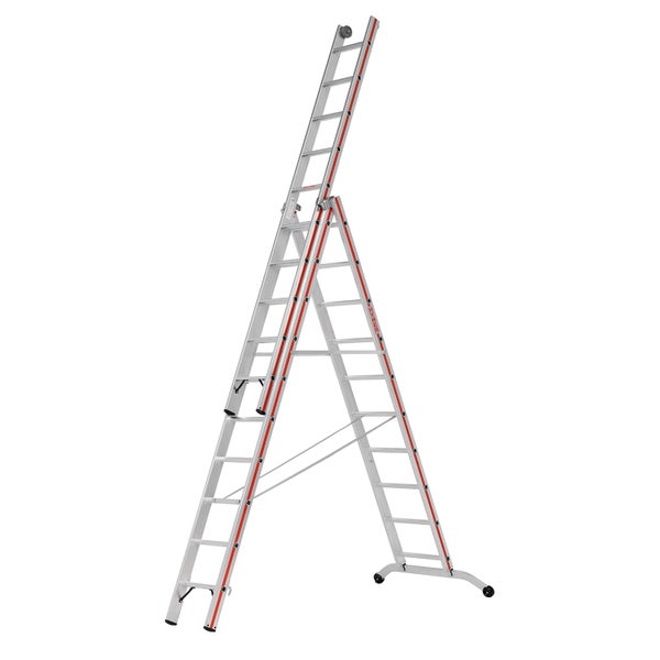 Mehr Bodenfreiheit und sicherer Stand dank gebogener Traverse Komfortables Ausfahren der Leiter mittels Wandlaufrollen Aushängbare, starre Streben verhindern unbeabsichtigtes Zusammenklappen Multifunktionale Verwendung Ergonomisches Arbeiten auf 80 mm Stufentiefe am Leiteroberteil Vorderkante mit Holm bündig Geringeres Gewicht aufgrund der Kombination aus Stufen und Sprossen Erhöhte Rutschsicherheit der Stufen und Sprossen dank stark profiliertem Strangpressprofil Leiterinnenbreite 300 mm (Oberteil) Verschraubte Leiterfüße Massive Stahlbeschläge Hinweis Für die korrekte Verwendung der Leiter wird auf die nationalen Regelungen (in Deutschland z. B. TRBS 2121-2) verwiesen