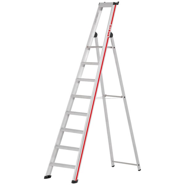 Ergonomisches Arbeiten auf 80 mm Stufentiefe Vorderkante mit Holm bündig Höhere Verwindungsstabilität dank robustem D-Holm-Konzept Höchste Stabilität dank 8-fach vollvernieteter Stufen Extra große Leiterschuhe für einen sicheren Stand Einfach zu reinigender, geschlossener Holm Massive Ablageschale aus Aluminium mit Eimerhaken Vernietete Leiterschuhe Plattformabmessung 250 x 250 mm