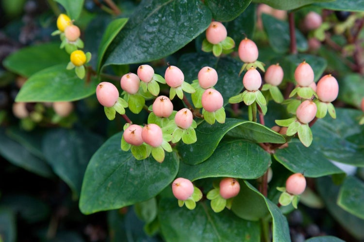 Hypericum inodorum ‘Magical Beauty’, das Zier-Johanniskraut, verbindet sommerliche Blütenpracht mit dekorativem Beerenschmuck und ist damit ein vielseitiger Blütenstrauch für Garten und Terrasse. Die Sorte zeigt ab Juni bis in den Spätsommer zahlreiche leuchtend gelbe Schalenblüten mit zierenden Staubgefäßen, aus denen sich im Anschluss auffällige, zunächst korallen- bis rosarote Fruchtstände entwickeln, die im Verlauf über rot bis dunkel purpur bis fast schwarz nachreifen. Das frischgrüne, gesunde Laub steht in attraktivem Kontrast zu Blüten und Beeren und bleibt lange dekorativ. Der kompakte, dicht verzweigte Wuchs macht ‘Magical Beauty’ zum idealen Gartenstrauch für das Staudenbeet, den Vorgarten oder die Gruppenpflanzung; ebenso überzeugt er als Solitär im Entrance-Bereich und als Kübelpflanze auf Balkon und Terrasse. In lockeren, niedrigen Blütenhecken sorgt dieser Zierstrauch für Struktur und ganzjährige Blickpunkte. Bevorzugt wird ein sonniger bis halbschattiger Standort mit durchlässigem, humosem, mäßig nährstoffreichem Boden; kurzzeitige Trockenheit wird nach dem Einwurzeln gut toleriert, Staunässe sollte vermieden werden. Ein Rückschnitt im zeitigen Frühjahr fördert die Vitalität, hält die Heckenpflanze kompakt und regt die Bildung junger, blühfreudiger Triebe an. In Gefäßen empfiehlt sich eine gleichmäßige Wasserversorgung und eine Drainageschicht, im Beet genügt in der Regel eine mulschende Abdeckung. Mit seiner langen Zierwirkung von der Sommerblüte bis zum herbstlichen Beerenschmuck ist Hypericum inodorum ‘Magical Beauty’ eine pflegeleichte, formschöne Bereicherung für vielfältige Gartensituationen.