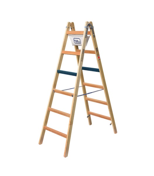 Breitsprossenstehleiter aus Holz speziell für die Anforderungen von Elektrikern und Malern Ab der 3. Sprosse von oben stehen Sie bequem auf extra breiten (36 mm) waagrecht eingebauten Sprossen Rundum geschlossene Werkzeugablage und Eimerhaken serienmäßig Ab Größe 2 x 9 mit normalen 4-kant-Sprossen Größe 9 - 14 mit blauer ERGO-Sprosse (3. v. oben), ansonsten mit klassichen 4-kant Sprossen Ausgesuchte Hölzer mit besonders fein gearbeiteter Oberfläche durch Hydro-Hobelverfahren Scharniere mit zusätzlichen Holmzwingen Hochfeste Polyester Sicherheitsgurte Extra breite Ausführung Breite am Leiternkopf 38 cm, Konizität 3 cm / Sprosse Entspricht EN 131 Gewerbliches Arbeiten auf Sprossenleitern ist nach TRBS 2121-2 nur mit Zubehör zulässig