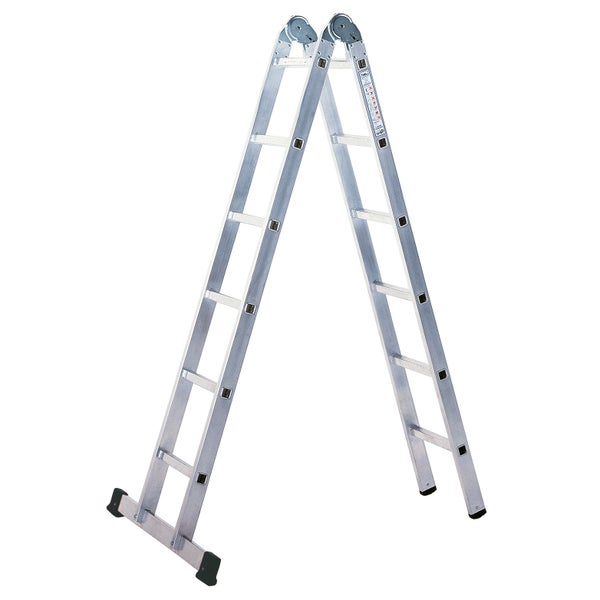 Klappleiter aus Aluminium, beidseitig begehbar oder als Anlegeleiter nutzbar. Entspricht DIN EN 131 Traverse zur Verbesserung der Standsicherheit Hochfestes Aluminium Strangpressprofil Robuste Rastergelenke aus verzinktem Stahl im Holm verschraubt, dadurch auswechselbar Rutschfeste Gummifüße im Holm verschraubt – leicht auswechselbar Hinweis Gewerbliches Arbeiten auf Sprossenleitern ist nach TRBS 2121-2 nur mit begründeter Gefährdungsbeurteilung oder mit Zubehör zulässig • Einsetzbar als: - Stehleiter - Anlegeleiter