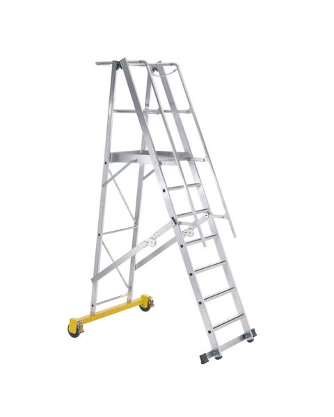 Podestleiter zusammenlegbar Sicherer Stand auf großer Plattform (60x63 cm) Dreiseitiges Sicherheitsgeländer 80 mm tiefe Stufen mit Kunststoffeinsätzen zur Rutschsicherung Große Kommissionierablage Stützteil mit Laufrollen 160 mm und Quertraverse Zusammenklappbar und damit raumsparend abzustellen Zwei Handläufe legen sich beim Zusammenklappen an die Leiter an Steigteil mit zusätzlichen Quertraversen für noch besseren Stand Entspricht DIN EN 131-7 Ermöglicht TRBS konformes Arbeiten