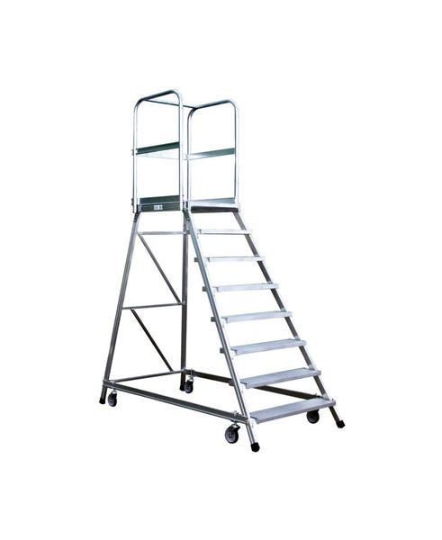 Podestleiter fahrbar, einseitig begehbar Mit Aluminium-Stufen und Plattform Praktische und vielfältig einsetzbare Steighilfe Trittsichere Stufen, 200 mm tief, Stufenabstand 240 mm, Neigung 60° Geräumige Plattform mit 600x800 mm Standfläche Entspricht DIN EN 131-7 Ermöglicht TRBS konformes Arbeiten 4 gefederte Lenkrollen (125 mm) Plattformgeländer 1,0 m hoch, komplett mit Fuß- und Knieleisten Versand erfolgt in montagegünstigen Bauteilen Ab 1,00 m Podesthöhe bzw. 5 Stufen ist ein beidseitiger Handlauf Pflicht Sonderabmessungen auf Anfrage