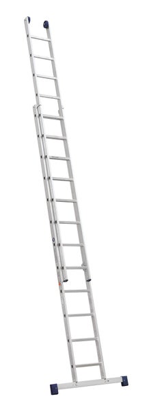Sprossenschiebeleiter in Handwerkerqualität, 2-teilig Von Sprosse zu Sprosse ausschiebbar Automatische Abhebesicherung am Schiebeteil Gleitsichere Leiternfüße Robuste Stahlbeschläge Beide Leiternteile getrennt verwendbar Mit Traverse zur Standverbreiterung Traversengröße 60 x 30 mm Nach DIN EN 131 TRBS konform als Verkehrsweg