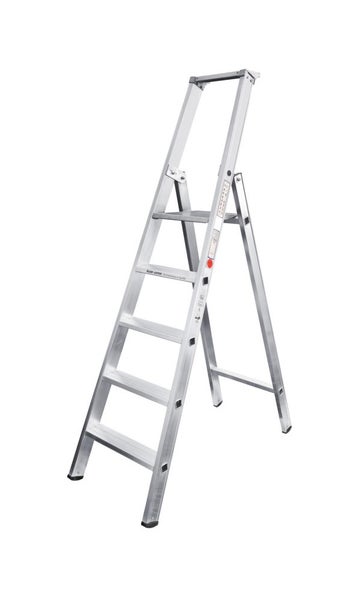 Trittsicher profiliert für bequemen und sicheren Stand Einseitig begehbar Mit Sicherheitsplattform 80 mm tiefe Stufen, rutschsicher profiliert besonders stabiles Holmprofil mit Sicken Rutschfeste Gummifüße im Holm verschraubt - dadurch leicht auswechselbar Stufen - Holm Verbindung durchgesteckt und verbördelt Stabile Aluminium-Druckgussplattform Ablageschale aus Aluminium-Durckguss mit Eimerhaken Plattformhöhe: 0,69 m Holmgröße 70 mm Nach DIN EN 131 Ermöglicht TRBS konformes Arbeiten Polyester Sicherheitsgurte ab Größe 6