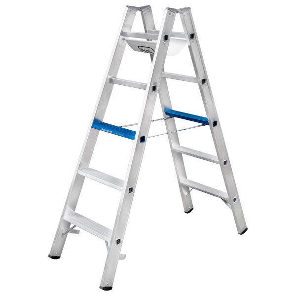 Stufenstehleiter in Industriequalität in neuartiger Hybridbauweise, TRBS konformes Arbeiten selbstverständlich da der sicherheitskonforme Standbereich optisch durch die blaue Stufe definiert ist nach DIN EN 131 80 mm Stufen im Arbeitsbereich, oben 2 Sprossen für beste Standergonomie ergonomisches und sicheres Stehen auf der Leiter durch steilen Aufstellwinkel von 70° mehr Beinfreiheit durch den oberen Leiternabschluss mit Sprossen Werkzeugablage serienmäßig kräftige Alu Druckgussgelenke rutschfeste Gummifüße im Holm verschraubt, dadurch leicht auswechselbar Holmgröße 70 mm