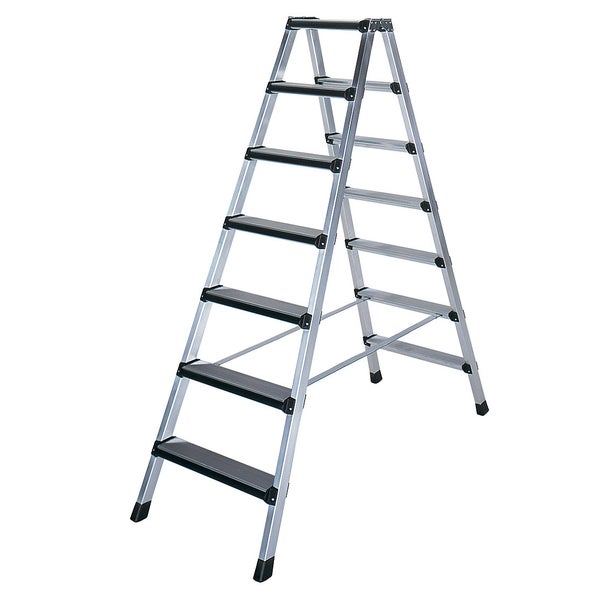 Stufenstehleiter, beidseitig begehbar mit bis zu 2 x 10 Stufen die Holme und Stufen sind abriebfest eloxiert dadurch keine Verschmutzung der Hände durch das Aluminium ideal für den Einsatz in Büros und Geschäftsräumen Stufen-Vorderkanten mit Gummilippe gepolstert 80 mm tiefe Stufen, trittsicher profiliert für bequemen und sicheren Stand Holmgröße 42 mm nach DIN EN 131 ermöglicht TRBS konformes Arbeiten Breite am Leiternkopf 35 cm, Konizität 2,5 cm / Stufe Polyester Sicherheitsgurte geschraubte Stufen - Holm Verbindung