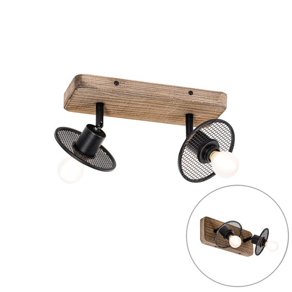 Industrieller Deckenstrahler schwarz mit Holz 2-flammig - Jasmijn