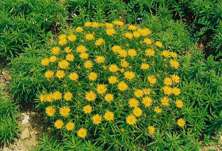 Inula hirta, der Rauhaarige Alant, ist eine robuste, sommerblühende Staude mit zierlichen, leuchtend gelben Strahlenblüten, die an kleine Sonnen erinnern und von Juni bis August für freundliche Akzente im Beet sorgen. Der botanische Charme dieser Inula zeigt sich in horstigem, kompaktem Wuchs von etwa 30 bis 50 cm Höhe, schmalen, rau behaarten Blättern und einem natürlichen, leicht wilden Charakter, der hervorragend in Steingarten, Präriebeet und Bauerngarten passt. Als Beetstaude eignet sie sich sowohl für die Gruppenpflanzung als auch als kleine Solitärpflanze im Vordergrund von Staudenrabatten; ebenso macht sie in durchlässigen Kübeln und Töpfen auf Terrasse oder Balkon eine gute Figur, sofern das Substrat locker und sandig ist.