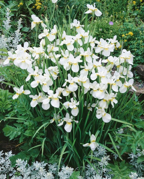 Iris sibirica ‘White Swirl’, die Sibirische Schwertlilie, ist eine elegante Gartenstaude, die mit reinweißen, leicht gewellten Blüten und zartgelben Zeichnungen im Schlund ein klassisch-zeitloses Bild in Beeten und Rabatten schafft. Von Ende Mai bis Juni zeigt der Blütenstrauch-Charakter dieser Zierstaude sein volles Potenzial, während das schmale, grasartige Laub in sattem Grün als strukturstarker Hintergrund bis in den Herbst attraktiv bleibt. Der aufrechte, horstbildende Wuchs wirkt besonders edel in der Einzelstellung als Solitär, entfaltet aber ebenso in der Gruppenpflanzung entlang von Wegen, am Teichrand oder als akzentsetzender Gartenstrauch im Vorgarten große Wirkung. Als Kübelpflanze in größeren Gefäßen auf Terrasse und Balkon lässt sich die Sorte ebenfalls kultivieren, sofern eine gleichmäßige Wasserversorgung gewährleistet ist.