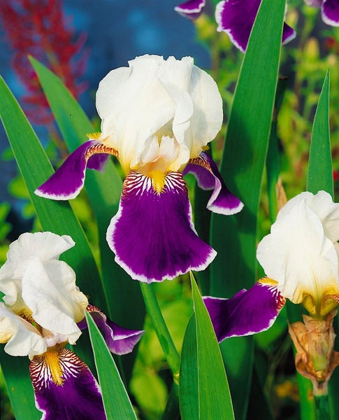 Die Iris x barbata-elatior ‘Wabash’, auf Deutsch Hohe Bart-Iris ‘Wabash’, ist eine klassische Blütenstaude mit eindrucksvoller Zweifarbigkeit. Ihre edlen Blüten erscheinen von Mai bis Juni und zeigen schneeweiße, leicht gewellte Domblätter, die mit samtig violettpurpurnen Hängeblättern kontrastieren; eine goldgelbe bis cremefarbene Bartleiste setzt einen leuchtenden Akzent und ein feiner Duft rundet den Auftritt ab. Der aufrechte, horstbildende Wuchs mit schwertförmigem, graugrünem Laub verleiht dieser Gartenstaude auch außerhalb der Blüte Struktur und Eleganz. Mit einer Höhe von etwa 80 bis 100 cm eignet sich die ‘Wabash’ hervorragend für den vorderen bis mittleren Beetbereich, als markanter Solitär oder in stimmigen Gruppenpflanzungen in Rabatten und Bauerngärten. Ebenso schmückt sie repräsentative Vorgärten und kann in ausreichend großen, gut drainierten Kübeln auf Terrasse und Sitzplatz als Zierpflanze glänzen; als Schnittblume setzt sie edle Akzente in der Vase.