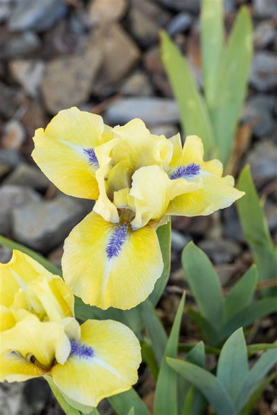 Iris × barbata-nana ‘Stockholm’, die Zwerg-Bart-Iris, ist eine elegante Blütenstaude für sonnige Lagen, die mit zarten, himmelblauen bis violettblauen Blüten und einem kontrastierenden, gelblich-weißen Bart begeistert. Sie blüht früh im Jahr, meist von April bis Mai, und setzt damit leuchtende Akzente im Steingarten, am Beetrand und im Vorgarten. Ihr kompakter, horstbildender Wuchs von etwa 20–30 cm Höhe und das schwertförmige, graugrüne Laub verleihen der Pflanze eine klare, architektonische Wirkung, die sowohl in kleinen Gruppen als auch als kleiner Solitär hervorragend zur Geltung kommt. Als pflegeleichte Staude eignet sich die Zwerg-Bart-Iris zudem sehr gut als Kübelpflanze auf Terrasse und Balkon, wo sie mit anderen Frühlingsblühern, niedrigen Gräsern oder Polsterstauden harmoniert.