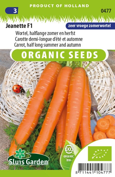 Entdecken Sie die Jeanette F1 halblange Sommer- und Herbstkarotte - Biologische Samen für Ihren Garten. Samen für gesunde und leckere Karotten.