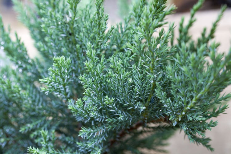 Juniperus sabina ‘Tam No Blight’, der Sadebaum, ist ein niedrig wachsendes, immergrünes Nadelgehölz und vielseitiges Ziergehölz für moderne Gärten. Die schuppenförmigen Nadeln leuchten frisch- bis blaugrün und zeigen in der kalten Jahreszeit einen dezenten Bronzeanflug, was dem Garten ganzjährig Struktur und Farbe verleiht. Der Wuchs ist teppichbildend bis breit ausladend, dicht verzweigt und gleichmäßig, ideal als robuster Bodendecker, als flacher Gartenstrauch im Vorgarten oder als formschöne Konifere im Steingarten und Heidegarten. Die Blüte ist unscheinbar im Frühjahr, anschließend erscheinen kleine, blau-schwarze Beerenzapfen, die den Schmuckwert zusätzlich erhöhen. Als Solitär auf Mauerkrone oder in der Gruppenpflanzung entfaltet die Sorte ihre flächige Wirkung besonders gut; im großzügigen Kübel auf Terrasse oder Balkon überzeugt sie als pflegeleichte Kübelpflanze mit klarer, grafischer Linienführung.