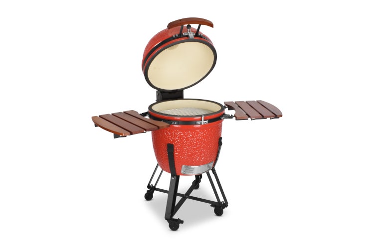 Damit es Ihnen an nichts fehlt, wird der Grill mit einem umfangreichen Zubehörpaket geliefert: Zwei einklappbare Ablagen aus Bambusholz links und rechts neben dem Grilldom bieten genügend Ablagefläche, damit sie immer wissen, wo Grillgut, Besteck oder Getränk ihren Platz finden. Sein Gestell bietet dem Kamado nicht nur einen sicheren Stand und hebt ihn in eine angenehme Arbeitshöhe, sondern ist auch mit vier Schwerlastrollen ausgestattet, um ihn mit wenig Mühe zu bewegen. Damit beim Grillen nichts rollt, besitzen zwei der Räder Feststellbremsen.