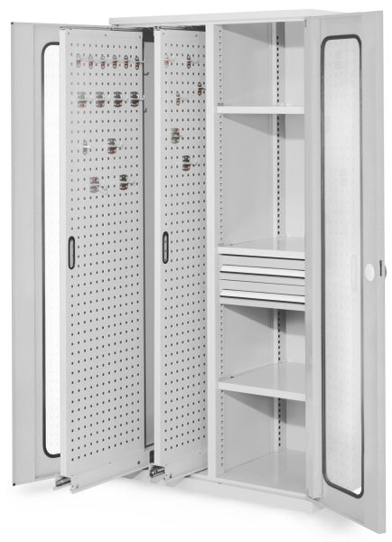 ®RasterPlan Vertikalschränke schaffen Ordnung und Übersicht.Werkzeuge, Schlüsselprofile, etc. werden auf engstem Raum gelagert und sind jederzeit griffbereit. Die Vertikalschränke sind entweder nur mit Auszügen oder einer Kombination mit Stahlböden und Schubladen ausgestattet. Es wird eine Wand- oder Bodenverankerung empfohlen. Stabile Stahlblechkonstruktion Schlag- und kratzfeste Kunststoffbeschichtung Korpus lichtgrau Glatte Fronten durch vorgebaute Türen Öffnungswinkel über 200° Durchgehende Gestängeführung Doppelwandige verstärkte Türen, Lochplattentüren, Sichtfenstertüren Teleskopgeführte Schubladen mit Vollauszug Auf Wunsch, auch nachrüstbar Schubladenbelastung 110 kg g.v.L. Vertikalauszüge teleskopschienengeführt, Vollauszug, mit beidseitiger ®RasterPlan Systemlochung Auszugbelastung 100 kg g.v.L. Nutzfläche: 428 x 1720 mm / 12 x 46 Löcher Nutztiefe: 90 mm, je Seite Verzinkte Fachböden Tragkraft 80 kg g.v.L. Verstellbarkeit 25 mm Raster Dreiriegeliges Sicherheits-Zylinderschloss