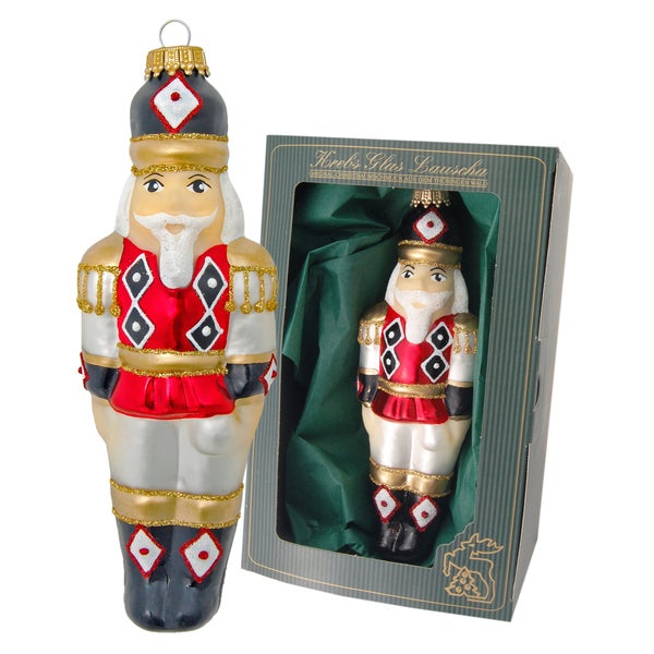 Tauche ein in die festliche Atmosphäre mit unserem exquisiten Glasornament! Dieses karierte Nussknacker-Glasornament ist ein wahrer Blickfang für deinen Christbaum. In den Farben Rot, Silber und Gold strahlt es Eleganz und Festlichkeit aus.