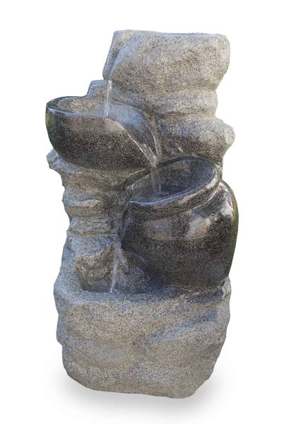- Exklusiver Kaskadenbrunnen aus Polyresin mit eingearbeitetem Sandstein, dadurch von echtem Stein kaum zu unterscheiden. Das von Schale zu Schale plätschernde Wasser ergibt ein beeindruckendes Wasserspiel.