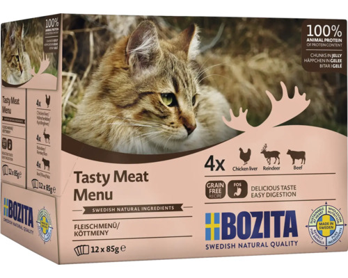 Katzenfutter nass BOZITA Tasty Meat Menu Häppchen in Gelee Multibox 12x85 g, 6x Rentier, 3x Hühnchenleber, 3x Rind getreidefrei