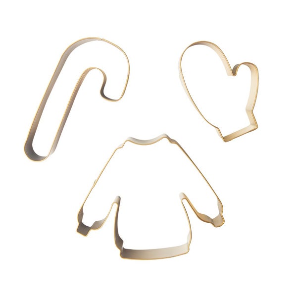 Backen Sie lustige (Weihnachts-)Kekse mit diesem Keksausstecher-Set Winter aus der Pluto Design Kollektion. Dieses Set besteht aus 3 verschiedenen Formen von Keksausstechern und ist aus goldfarbenem Edelstahl gefertigt.