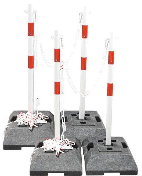 Kettenständer Set schwere Stahl Kettenpfosten als 1m x Ø42mm inkl. Kette, 18 kg Fuß / Kette weiß / Set A = 4 Pfosten