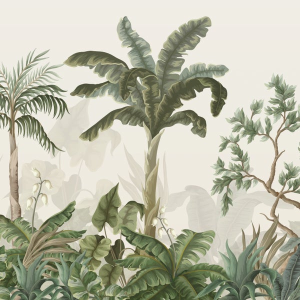 Entdecke die aufregende Welt des Dschungels für das Kinder- oder Babyzimmer mit einer liebevoll gestalteten Motivtapete, die eine zauberhafte und beruhigende Atmosphäre schafft. Diese Tapete begeistert mit detailverliebt gestalteten Pflanzen, Bäumen und Palmen vor einem warmen, beigen Hintergrund. Die harmonischen Grüntöne und das lebendige Design wecken die Abenteuerlust und zaubern eine unbeschwerte, exotische Stimmung, die Kinderherzen höher schlagen lässt.