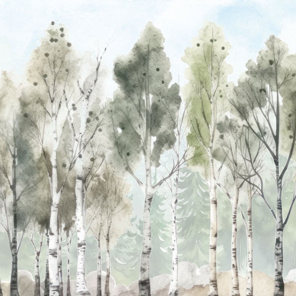 Entdecke eine traumhafte Tapete für das Kinder- oder Babyzimmer, die mit liebevoll gestalteten Details eine zauberhafte und beruhigende Atmosphäre zaubert. Das fantasievolle Design zeigt sanfte Birken und Tannen im Hintergrund, was perfekt zu einem naturinspirierten Kinderzimmer passt. Die zurückhaltende Farbgebung fügt sich harmonisch in jede Umgebung ein und sorgt für eine entspannte Stimmung.
