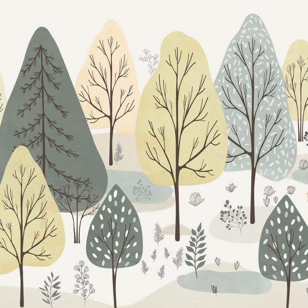Verzaubere das Kinderzimmer mit dieser liebevoll gestalteten Motivtapete, die eine Vielzahl von Bäumen und Pflanzen in sanften Pastelltönen zeigt. Perfekt abgestimmt für einen naturinspirierten Raum schafft sie eine beruhigende Atmosphäre, ideal für kleine Träumer und Abenteuerlustige. Die bewusst reduzierten und natürlichen Farben fügen sich nahtlos in dein Zuhause ein und verwandeln das Zimmer in eine harmonische Rückzugsoase.