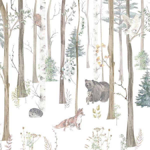 Entdecke eine bezaubernde Tapete für das Kinder- oder Babyzimmer, die mit liebevoll gestalteten Waldtieren und einer Vielzahl von Pflanzen in sanften Aquarellfarben überzeugt. Diese wunderschöne Tapete schafft eine zauberhafte und beruhigende Atmosphäre, die perfekt für kleine Träumer ist. Die harmonisch auf das Format abgestimmten Motive verleihen der Wand eine natürliche und entspannte Ausstrahlung und unterstützen ein stilvolles Kinderzimmer im Natur-Look.