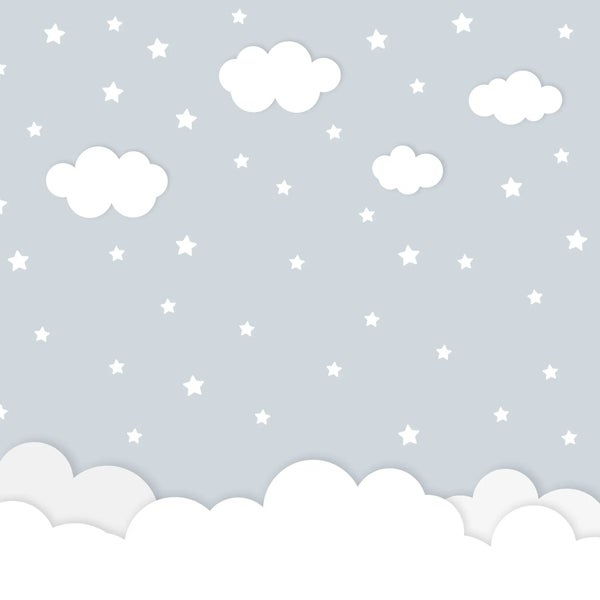 Entdecken Sie eine liebevoll gestaltete Tapete, die das Kinder- oder Babyzimmer in eine zauberhafte und beruhigende Oase verwandelt. Die sanften Farben und das fantasievolle Design mit Wolken und Sternen schaffen eine entspannte Umgebung, die sowohl zum Träumen als auch zum Spielen einlädt.