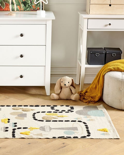 Baumwollteppich mit Stadtmotiv. Mit diesem handgewebten Baumwollteppich kannst du dein Kind auf eine lustige Reise mitnehmen. Das farbenfrohe Design zeigt eine kurvige Straße mit Bäumen, Gebäuden und vorbeifahrenden Autos, die die Fantasie deines Kindes anregen und zu stundenlangem kreativen Spiel anregen. Die rutschfeste Unterseite sorgt für Sicherheit, während der weiche Baumwollstoff stundenlanges Sitzen angenehm macht. Details: Typ Kurzflor. Farbe: Bunt. Material: Stoff. Material: Baumwolle. Zusätzliches Material: Polyester. Zusammenstellung: 95% Baumwolle. Form: Rechteckig. Rutschfeste Unterseite: Nein. Stoffgewicht: 1150 g/m2. Muster: Abstraktes Muster. Herstellungsmethode: Handgetuftet. Abmessungen: Florhöhe: 1.5 cm. Breite: 80 cm. Länge: 150 cm. Gewicht: 2 kg. .Sie kaufen: 1 x Teppich. Produktvorteile: Handgefertigt mit viel Liebe zum Detail, Besonders sicher dank rutschfester Unterseite, Dekorativ und zugleich funktional, Passt harmonisch in jedes Kinderzimmer, Handgefertigte Präzision. Montage: Benötigt keine Montage. Zusatzinformationen: Jeder Artikel ist ein handgefertigtes Unikat; Farbschattierung und Muster können daher vom Foto abweichen. Herstellungstechnik: Beim Handtuftverfahren wird das Garn mit einer speziellen Nadel in das Trägermaterial des Teppichs eingestochen. Dabei wird das Garn nicht so fest in das Trägermaterial eingearbeitet wie bei anderen Methoden (z.B. Webteppiche). Daher können sich manchmal einzelne Fäden lösen. Pflegeanleitung: 1.Staubsaugen einmal pro Woche ist ausreichend, um den Teppich sauber und gepflegt zu halten. Wir empfehlen dazu einen Staubsauger mit flacher, weicher Bürste und die Einstellung von mittlerer Saugleistung. Saugen Sie Ihren Teppich immer in Florrichtung ab. 2.Soweit das Format dies zulässt, drehen Sie den Teppich alle sechs Monate um 180 Grad. So erhalten sie eine gleichmäßige Abnutzung und vermeiden Sie Verbleichen der Farben durch Sonneneinstrahlung. 3.Entfernen Sie Flecken umgehend. Flüssigkeiten werden mit einem saugfähigen, nicht färbenden Baumwolltuch aufgenommen. Arbeiten Sie vom Rand nach innen und verreiben Sie den Fleck nicht. 4.Bei festem Schmutz können Sie die losen Schmutzteile vorsichtig abkratzen. Danach wird die Stelle mit klarem, lauwarmem Wasser abgetupft. Benutzen Sie dazu ein sauberes nicht färbendes Baumwolltuch sowie einen Fleckentferner speziell für Teppiche. Bitte befeuchten Sie den Teppich dabei nicht zu stark. Falls der Fleck hartnäckig sein sollte, wenden Sie sich bitte an ein Fachgeschäft für Teppichreinigungen. 5.Es wird empfohlen den ausgepackten Teppich mindestens ein paar Stunden (am besten ein oder zwei Tage) zu lüften. Dies ermöglicht den natürlichen Geruch des Materials, aus dem das Produkt gefertigt wurde, zu mildern.