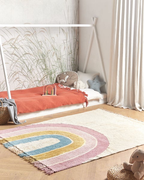 Rechteckiger Baumwollteppich mit Regenbogenmotiv für das Kinderzimmer. Dieser Fransenteppich belebt das Zimmer Ihres Kindes und verleiht ihm ein farbenfrohes, verspieltes Flair. Von Hand aus strapazierfähiger Baumwolle getuftet, fühlt er sich nicht nur weich und kuschelig an, sondern ist auch ein idealer Spielgefährte für Ihre Kleinen. Zudem kann er mit jeder Fußbodenheizung kombiniert werden. Sein auffälliges Regenbogenmuster und die mehrfarbigen Fransen werden jedes Kinderherz höher schlagen lassen. Details: Typ Kurzflor. Farbe: Beige. Material: Stoff. Material: Baumwolle. Zusammenstellung: 100% Baumwolle. Form: Rechteckig. Rutschfeste Unterseite: Nein. Stoffgewicht: 1500 g/m2. Muster: Für Kinder. Geeignet für Fußbodenheizung: Ja. Herstellungsmethode: Handgetuftet. Abmessungen: Florhöhe: 1 cm. Breite: 140 cm. Länge: 200 cm. Gewicht: 2 kg. .Sie kaufen: 1 x Teppich. Produktvorteile: Handgefertigt mit viel Liebe zum Detail, Wunderschöne, leuchtende Farben, Passt harmonisch in jedes Kinderzimmer, Handgefertigte Präzision, Hochwertiges Material. Montage: Benötigt keine Montage. Zusatzinformationen: Der Artikel benötigt einige Zeit, bis er seinen ursprünglichen Zustand erreicht hat – daher sollte er so schnell wie möglich ausgerollt werden und innerhalb von 72 Stunden seine vollständige Größe wieder erreichen. Für einen optimalen Effekt sollte man die Teppichkanten mit schweren Gegenständen fixieren. Jeder Artikel ist ein handgefertigtes Unikat; Farbschattierung und Muster können daher vom Foto abweichen. Herstellungstechnik: Beim Handtuftverfahren wird das Garn mit einer speziellen Nadel in das Trägermaterial des Teppichs eingestochen. Dabei wird das Garn nicht so fest in das Trägermaterial eingearbeitet wie bei anderen Methoden (z.B. Webteppiche). Daher können sich manchmal einzelne Fäden lösen. Pflegeanleitung: 1.Staubsaugen einmal pro Woche ist ausreichend, um den Teppich sauber und gepflegt zu halten. Wir empfehlen dazu einen Staubsauger mit flacher, weicher Bürste und die Einstellung von mittlerer Saugleistung. Saugen Sie Ihren Teppich immer in Florrichtung ab. 2.Soweit das Format dies zulässt, drehen Sie den Teppich alle sechs Monate um 180 Grad. So erhalten sie eine gleichmäßige Abnutzung und vermeiden Sie Verbleichen der Farben durch Sonneneinstrahlung. 3.Entfernen Sie Flecken umgehend. Flüssigkeiten werden mit einem saugfähigen, nicht färbenden Baumwolltuch aufgenommen. Arbeiten Sie vom Rand nach innen und verreiben Sie den Fleck nicht. 4.Bei festem Schmutz können Sie die losen Schmutzteile vorsichtig abkratzen. Danach wird die Stelle mit klarem, lauwarmem Wasser abgetupft. Benutzen Sie dazu ein sauberes nicht färbendes Baumwolltuch sowie einen Fleckentferner speziell für Teppiche. Bitte befeuchten Sie den Teppich dabei nicht zu stark. Falls der Fleck hartnäckig sein sollte, wenden Sie sich bitte an ein Fachgeschäft für Teppichreinigungen. 5.Es wird empfohlen den ausgepackten Teppich mindestens ein paar Stunden (am besten ein oder zwei Tage) zu lüften. Dies ermöglicht den natürlichen Geruch des Materials, aus dem das Produkt gefertigt wurde, zu mildern.